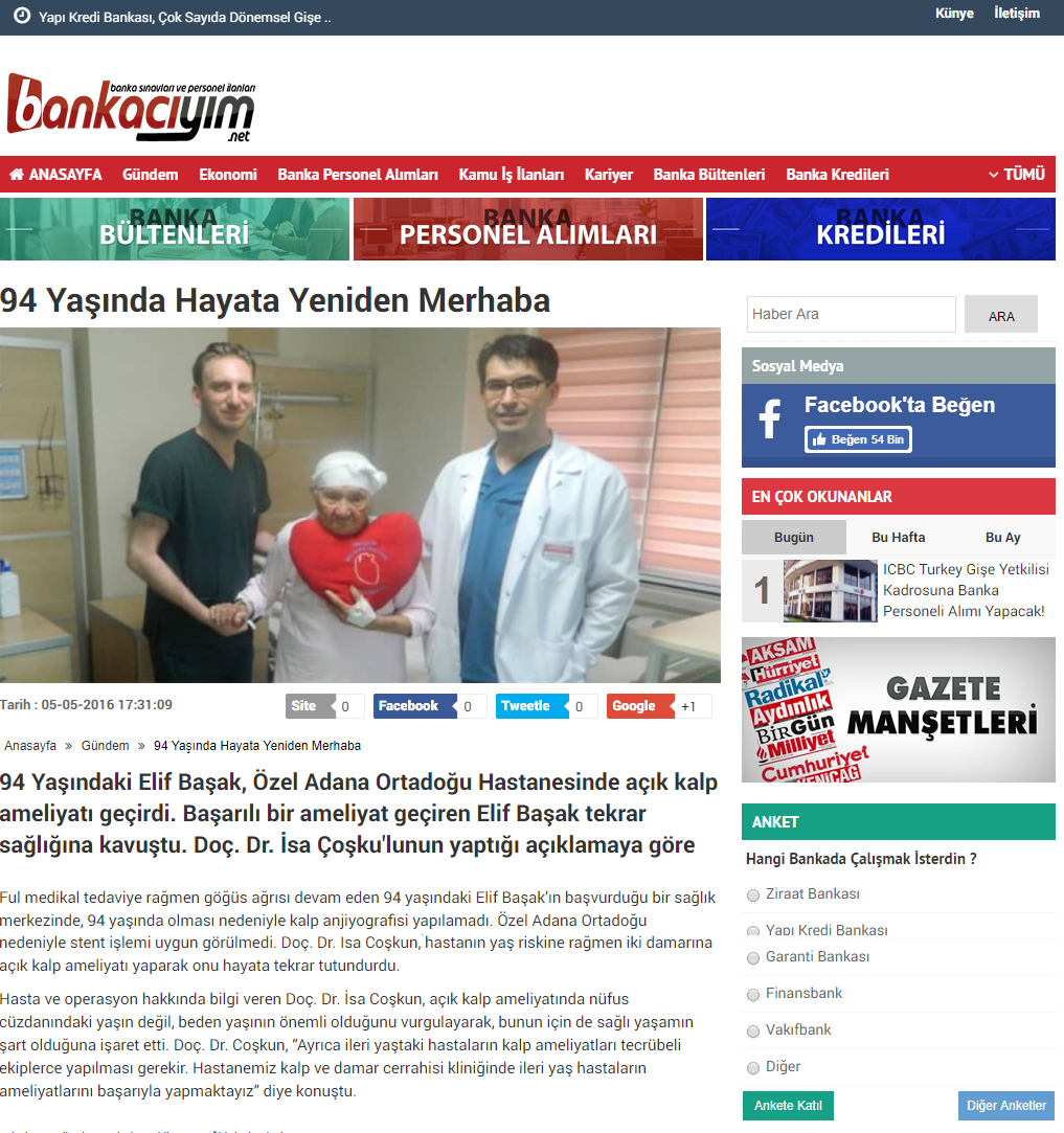 Ful medikal tedaviye rağmen göğüs ağrısı devam eden 94 yaşındaki Elif Başak’ın başvurduğu bir sağlık merkezinde, 94 yaşında olması nedeniyle kalp anjiyografisi yapılamadı. Özel Adana Ortadoğu Hastanesi kardiyoloji kliniğine başvuran Elif Başak’ın Uz. Dr. İbrahim Doğru tarafından kalp anjiyografisi çekildi. Hastanın kalp damarlarında ciddi daralma olduğu saptandı. Hastanın damarlarındaki darlıklar nedeniyle stent işlemi uygun görülmedi. Doç. Dr. İsa Coşkun, hastanın yaş riskine rağmen iki damarına açık kalp ameliyatı yaparak onu hayata tekrar tutundurdu.